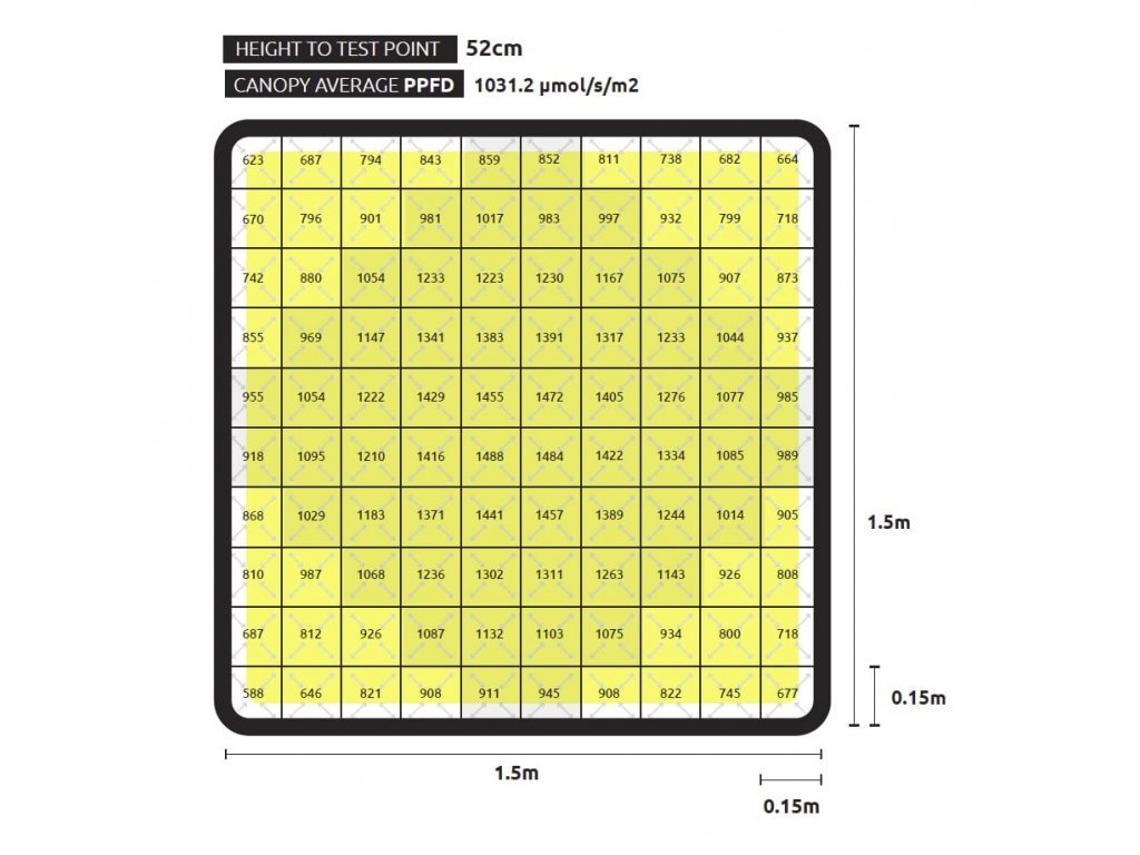 Lumatek Zeus 1000W LED je lineární svítidlo s 10 světelnými segmenty, které produkují vysoký světelný tok PPF 2925 µmol/s a účinností 2,9 µmol/J. Řady LED diod vytváří rovnoměrný rozptyl světla na krátkou vzdálenost od rostlin, což umožňuje osvětlení rostlin v nižších prostorech a pěstebních stanech.