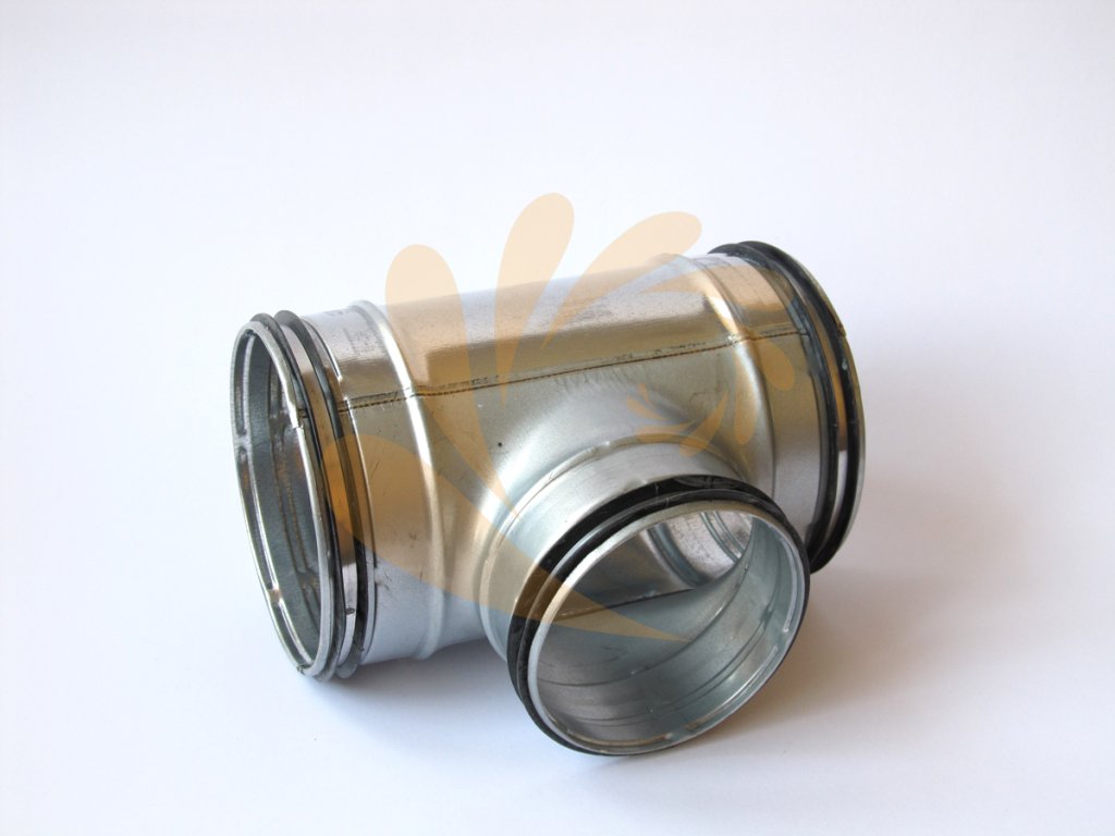 Část ventilace z pozinkovaného plechu určená k odbočení potrubí v pravém úhlu. Konce odbočky jsou doplněny gumovým těsněním.Doplňkové parametry