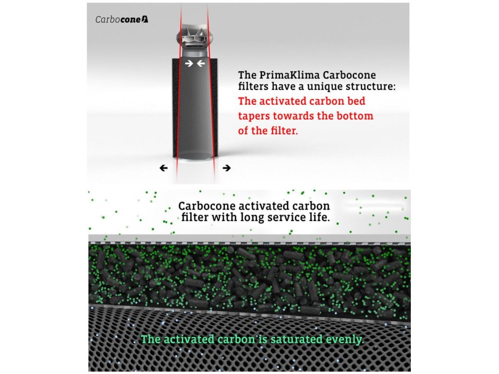 Vylepšený patentovaný kónický design vnitřního koše přináší skvělé benefity, jako prodloužení životnosti, zvýšení účinnosti filtrace až o 30 % a rovnoměrné využití aktivního uhlí. Vysoce účinná filtrace s aktivním uhlím stejně vysoké kvality jako u Industry Line. Dostupné s přírubou v mnoha praktických velikostech.
