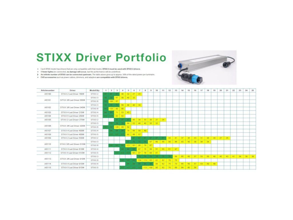 SANlight Driver STIXX 3/6 je předřadník určený výhradně pro zapojení LED svítidel SANlight STIXX. Dostupný v pěti výkonových variantách – 200 W, 240 W, 320 W, 610 W a 910 W. Produkt neobsahuje rozvodné ani prodlužovací kabely, svítidla ani jiné příslušenství.