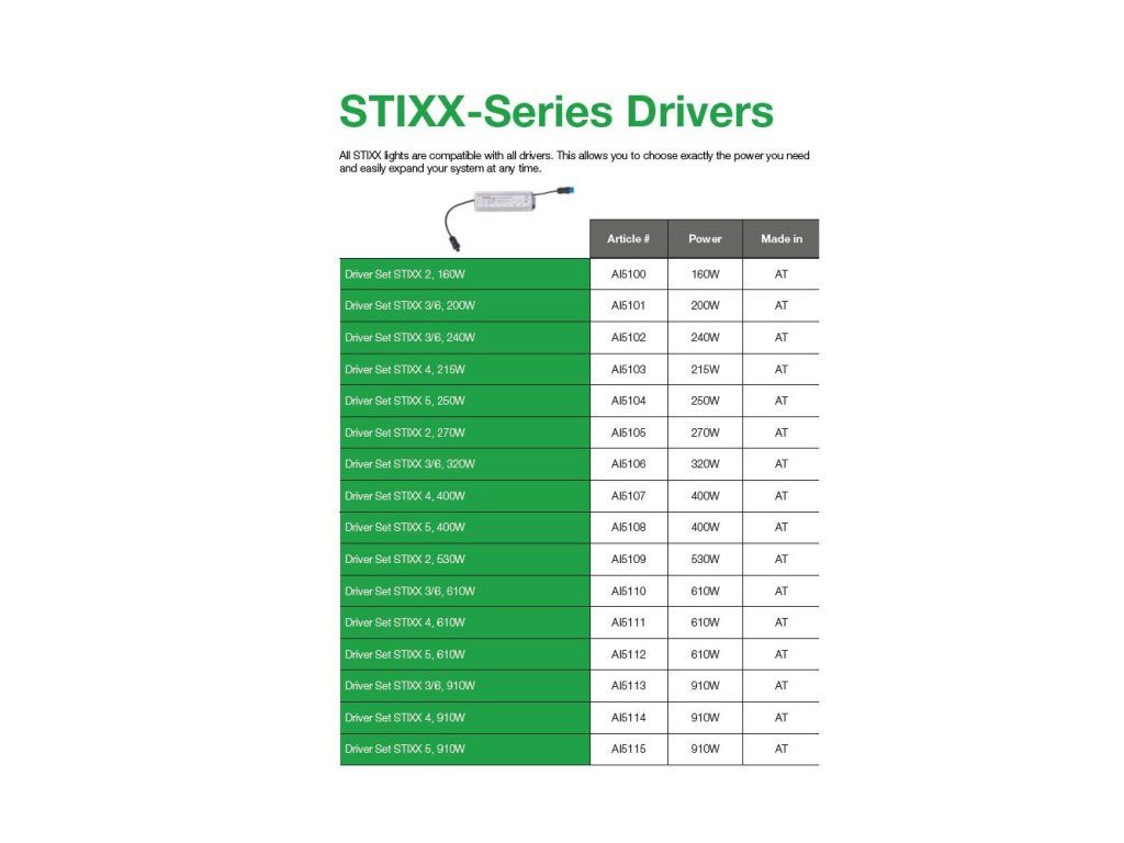 SANlight Driver STIXX 4 je předřadník určený výhradně pro zapojení LED svítidel SANlight STIXX. Dostupný ve čtyřech výkonových variantách – 215 W, 400 W, 610 W a 910 W. Produkt neobsahuje rozvodné ani prodlužovací kabely, svítidla ani jiné příslušenství.