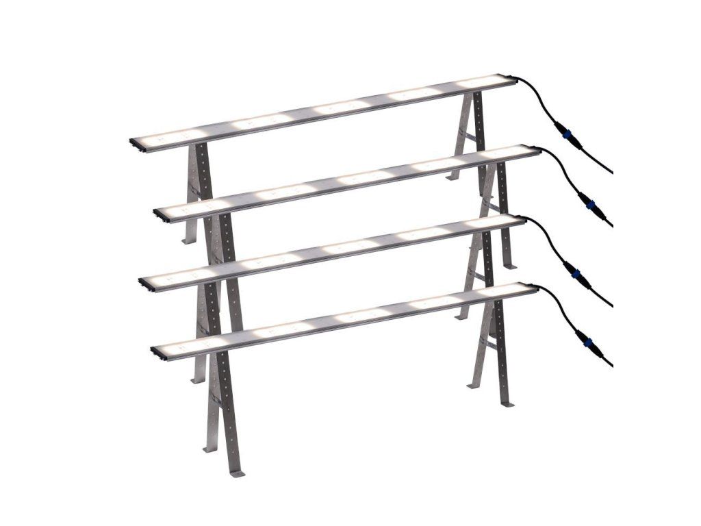Čtyři jednotky SANlight STIXX 5-120 Undercanopy poskytují dokonalé pokrytí pro plochy 120 × 240 cm. Délka svítidel 120 cm přesně ladí se šířkou stanu 240 cm. Sestava je ideální v kombinaci s výkonnými horními světly EVO 5 nebo EVO 4 a pro hustě osázené pěstební systémy. Krytí IP68, plné spektrum a asymetrická optika 90/135° zajišťují homogenní osvětlení pro růst i kvetení.